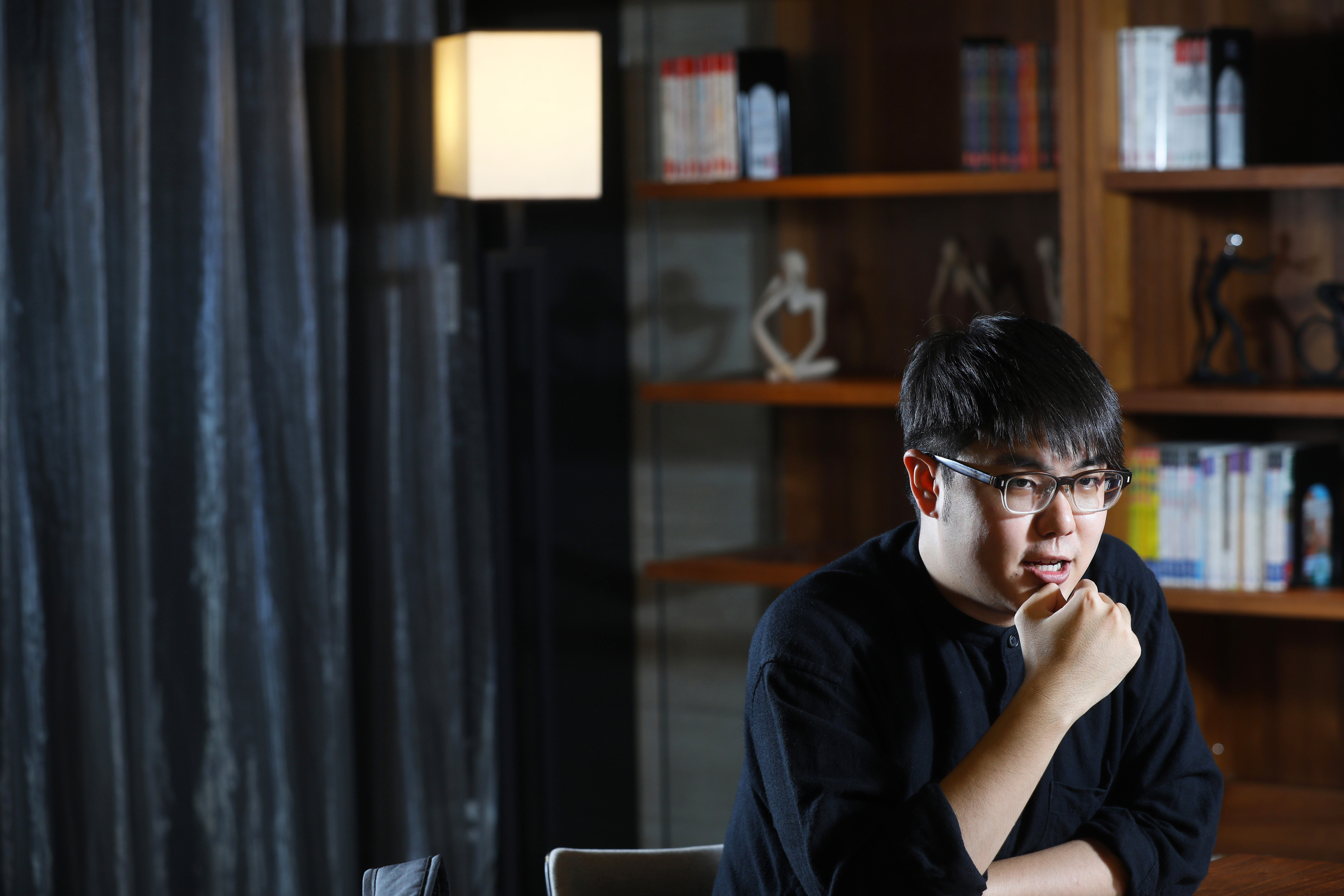 穿黑色的衣服,目的是為了給人沉穩的印象,採訪時他卻盤腿在沙發上,胸前抱著一顆抱枕說話,顯然稚氣未脫。